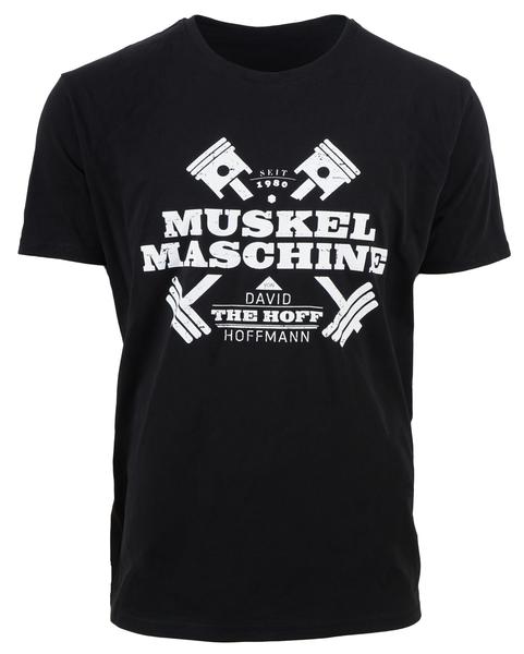 Baumwoll-Shirt in top Qualität, mit großem "Muskelmaschine" Aufdruck auf der Brust. David trägt in allen T-Shirts die Größe XL.